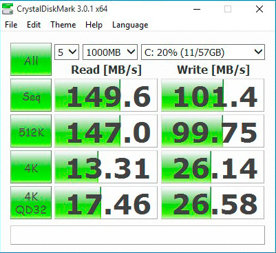 Быстродействие встроенной памяти по CrystalDiskMark. Кстати, вполне неплохо.