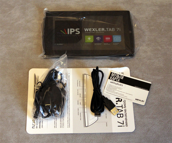 Планшет, адаптер питания, специальный USB-кабель ("папа-папа"), инструкция, карта с кодом для удвоения внесенной суммы на сайт библиотеки Wexler.