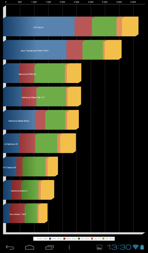 Запустил тест по Quadrant Pro - общий индекс устройства получился 1469. Это вроде как немного (для сравнения, у Galaxy Tab 10.1 - 2600), однако, например, у семидюймового Huawei MediaPad - 1763.