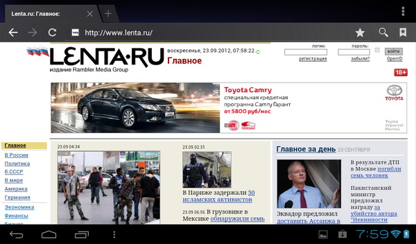 Браузер работает неплохо, однако тут чувствуется, что экранный сенсор не слишком чувствительный: есть небольшая задержка в реакции на прикосновения, масштабирование происходит недостаточно плавно. Но в общем и целом страницы серфить удобно.