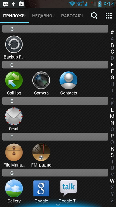 Приложения можно сортировать различными способами, также есть закладки, с помощью которых можно вызвать недавно используемые и работающие в настоящий момент приложения, - это удобно.