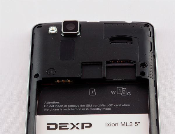 Под крышкой - двойной слот для сим-карт формата microSIM (первая сим-карта) и miniSIM (вторая сим-карта), также тут расположен слот для карты памяти microSD. (В спецификации не было указано по поводу размера карт памяти, но практика показала, что телефон поддерживает карты до 32 Гб - 64 Гб он уже не распознал.)
