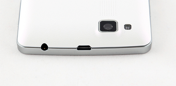 Задняя крышка: белый пластик со штамповкой, имитирующей текстуру кожи, который и не заляпывается, и в руке лежит очень неплохо. Динамик расположен прямо под глазком камеры.
