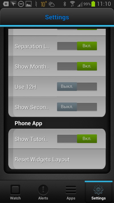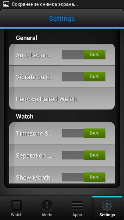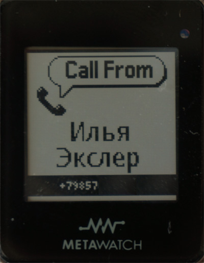 Еще телефон умеет выводить на дисплей информацию о входящем звонке и SMS - это настраивается в программе. Также там в ближайших планах компании информация о поступивших сообщениях по e-mail и уведомления из социальных сетей, но пока это не реализовано.