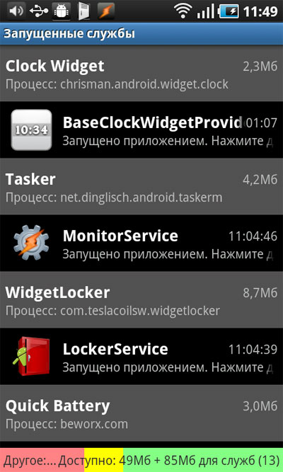 Также в системе предусмотрен просмотр запущенных служб (виджеты, сервисы), которые можно вручную останавливать.