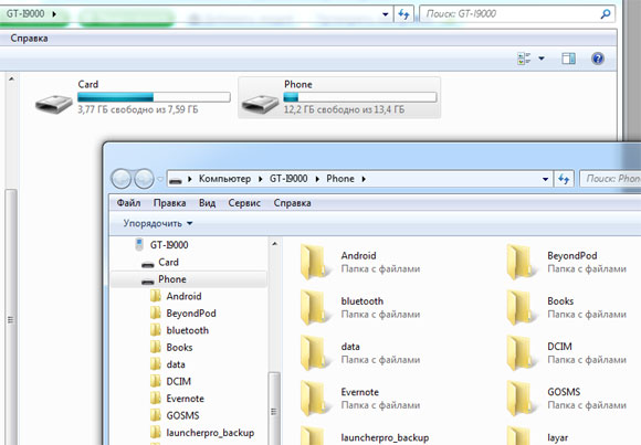 Папки телефона и карты памяти в проводнике