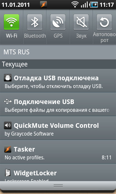 Отлично придуманная штука в Android - раскрываемая область уведомлений.  Работает это следующим образом. В верхней (или нижней - такое тоже бывает) части экрана есть полоска, в которой появляются самые разные уведомления: заряд аккумулятора, уровень сигнала мобильника, звук, активные программы, виды подключений и прочее. Аналогичная область есть и в iOS, и в Windows Mobile. Однако только в Android можно потянуть пальцем за эту область - и она откроется на весь экран, выдав список недавних событий, часть из которых может оказаться весьма полезной: например, информация об установленных программах или видах подключений. Также в некоторых прошивках в этой области сверху выводятся пиктограммы включения-выключения звука, GPS, беспроводной связи, автоповорота экрана.