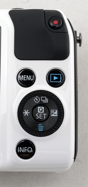 Ну и из кнопок управления на задней панели у нас осталось всего ничего: четырехпозиционное поворотное кольцо с центральной кнопкой (странно, что его все-таки оставили), кнопки "Меню", "Воспроизвести", "Info" и съемки видео.