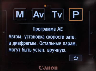 В режиме P на экран выводятся дополнительные пиктограммы, с помощью которых можно настроить компенсацию экспозиции и ISO. Левая верхняя пиктограмма становится активной - она как раз и переключает режимы (сцены).