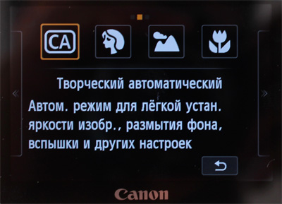 Творческий автоматический режим (с легкой настройкой дополнительных параметров), ну и всякие стандартные предустановленные сцены: портрет, пейзаж, макросъемка, спорт и так далее.