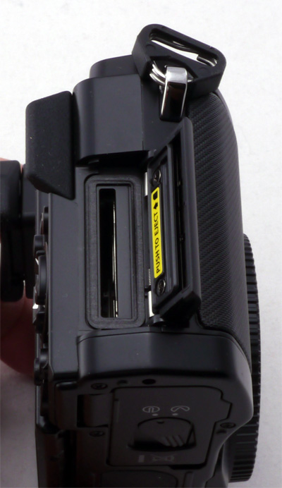 Карта памяти вставляется в отдельный слот с защелкой, расположенный в левом торце. Карта извлекается легко и просто. (В отличие от Sony NEX-6.)