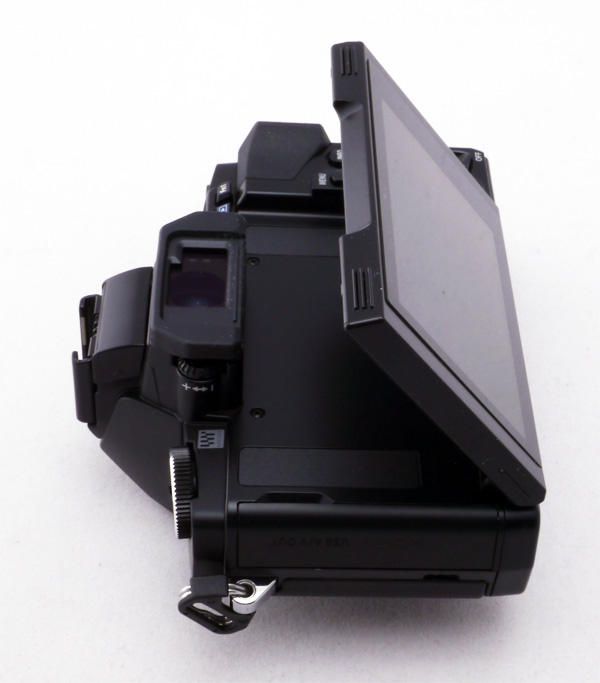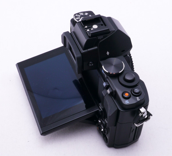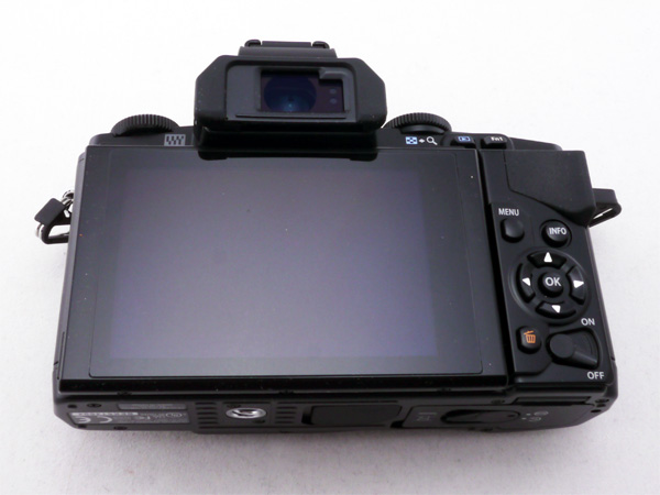 Задняя часть с видоискателем, стилизованным под пентапризму, и большим поворотным дисплеем.