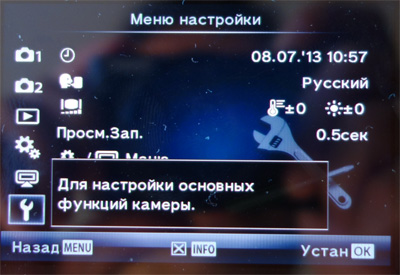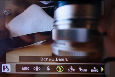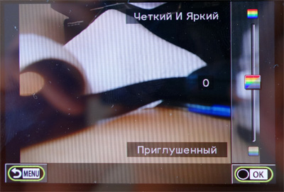 Экран тут сенсорный, но используется всего лишь для некоторых видов настроек. Например, можно задать режим наведения на резкость по прикосновению пальца к дисплею (желто-зеленый значок слева снизу).