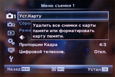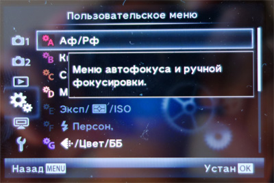 На самом деле самое главное меню - вот это, пользовательское, потому что здесь можно настраивать действия кнопок, функциональных кнопок (даже кнопки "Спуск") и колес - практически как угодно. У этого фотоаппарата чрезвычайно гибкие возможности настройки под пользователя - это нельзя не приветствовать.