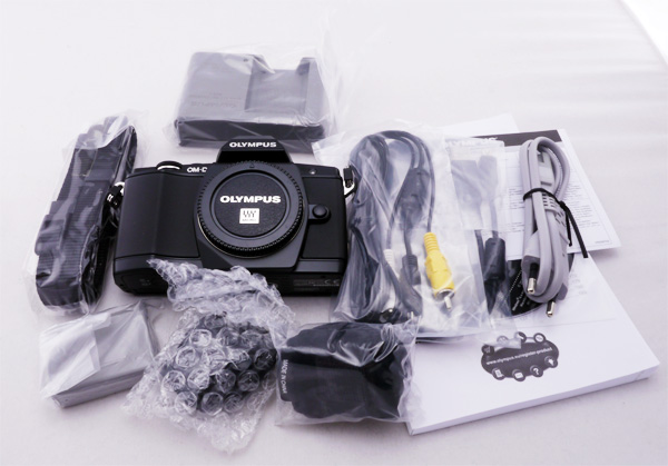 Комплектация: фотокамера, аккумулятор, зарядное устройство, плечевой ремень, USB-кабель, аудио- и видеокабель, диски с ПО, инструкция. (В комплект с китовым объективом вроде бы еще входит отдельная вспышка, которая ставится на горячий башмак и питается от аккумулятора аппарата. Здесь ее не было.)