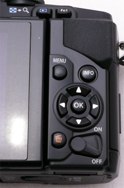 Задняя крышка: переключатель питания, кнопка удаления, курсоры с кнопкой ОК, информация, меню. И сверху две кнопки - просмотр и Fn1.