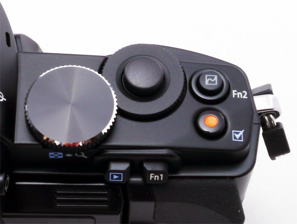 Правая верхняя часть: зубчатое колесо, кнопка спуск со вторым зубчатым колесом, кнопка Fn2 и кнопка видеозаписи (на нее также можно навесить какие-то другие функции). Вот тут все хорошо: два зубчатых колеса для выбора различных параметров, настраиваемая вторая функциональная кнопка и кнопка записи, расположенная очень удобно: с одной стороны, на нее легко нажимать, с другой - случайно, как в Sony Alpha NEX-5N, ее не нажмешь.