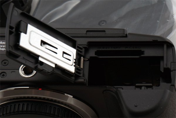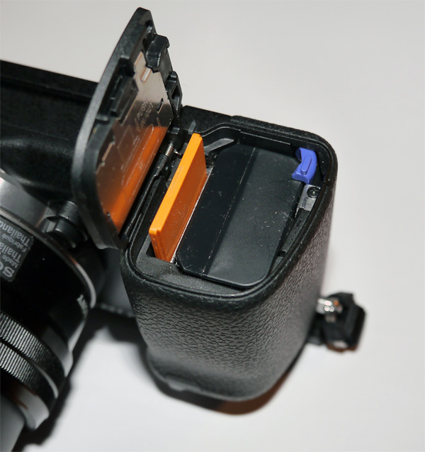 Слот для карты памяти расположен перпендикулярно крышке, поэтому вставлять карту и вынимать ее очень удобно. Для сравнения, у Sony NEX-6 карта вставляется параллельно крышке, причем очень близко к ней, и вот за это разработчиков надо убивать: вставлять карту - еще туда-сюда, а вот доставать - сущее мучение. Если учесть, что я люблю переливать фотографии не через кабель, а непосредственно с карты, - удовольствие это еще то.
