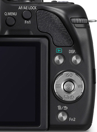 6. Курсоры с центральной кнопкой - стандартный элемент практически любого аппарата. Нередко комбинируется с поворотным колесом, но здесь этого нет. Курсоры служат для навигации, в режимах съемки с их помощью вызываются переключения для: вида фокусировки, ISO, баланса белого, режима работы затвора. Центральная кнопка вызывает большое меню настроек и в определенных ситуациях работает как кнопка "ОК".