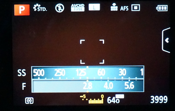 При нажатии на кнопку Display вид информации может меняться - например, в одном из режимов появляется полоса выдержки-диафрагмы, причем в ручном режиме съемки на полосе красным цветом отмечаются соотношения, при которых экспозиция выставлена явно неправильно.