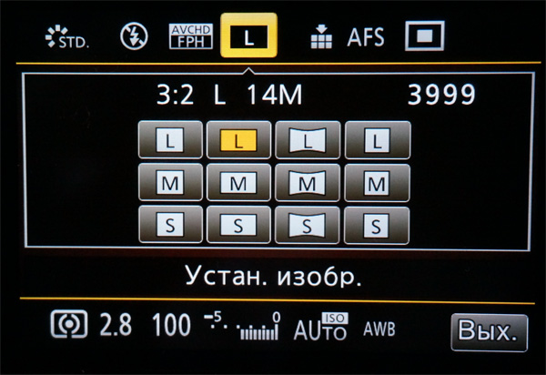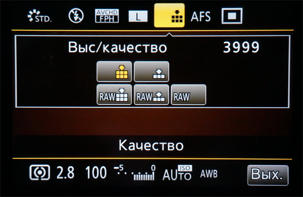 Настройка качества. Тут также можно выбрать режим съемки в RAW в трех вариантах: одновременно с качественным JPEG, со стандартным JPEG, вообще без JPEG.