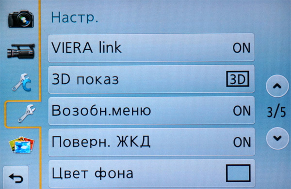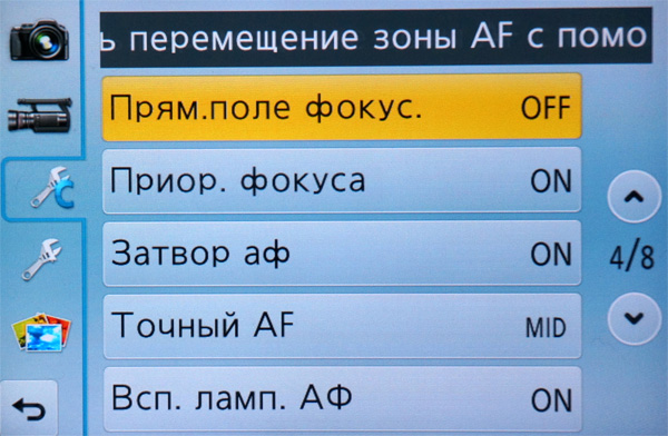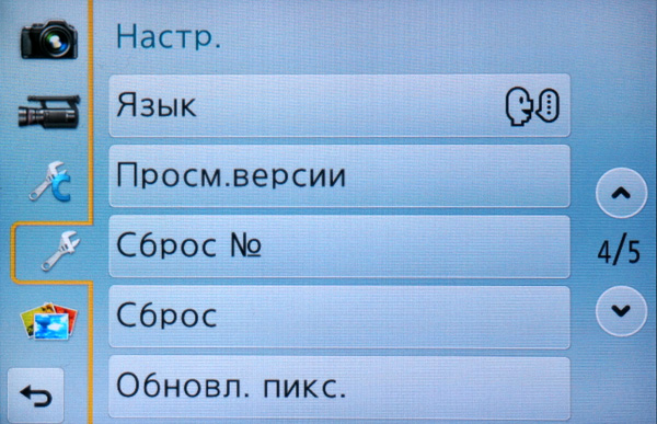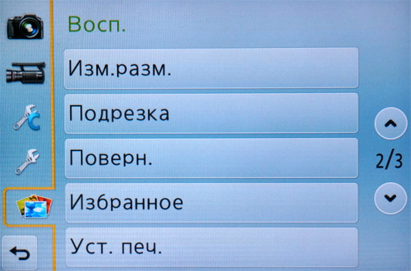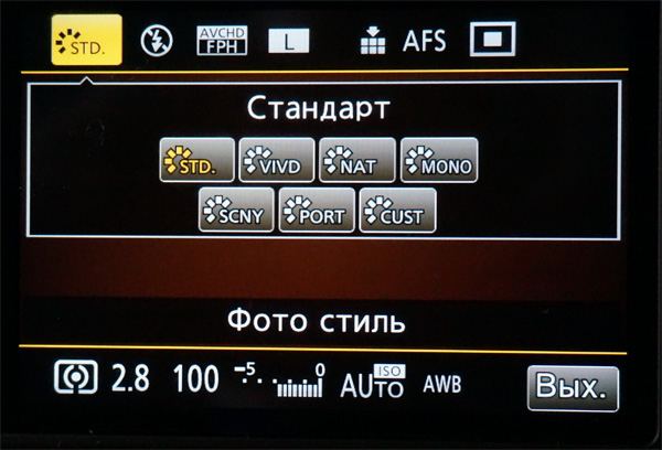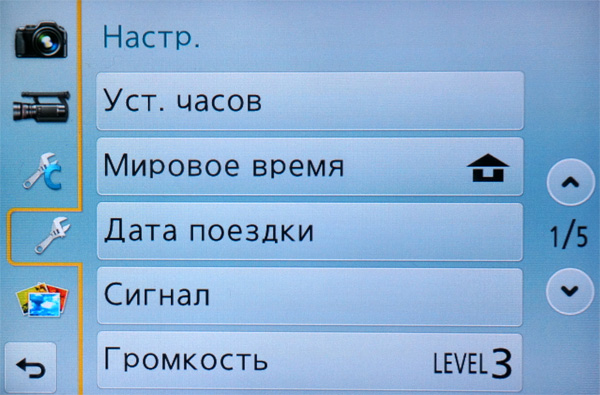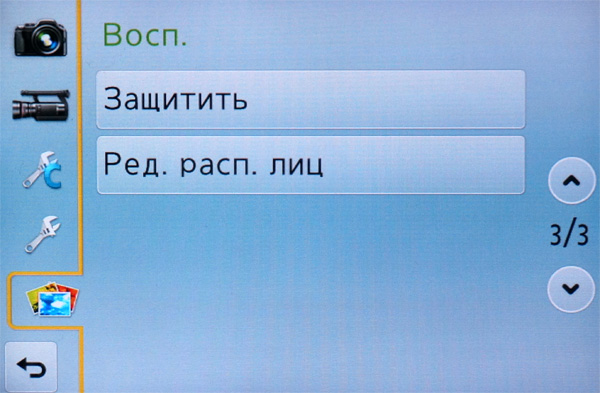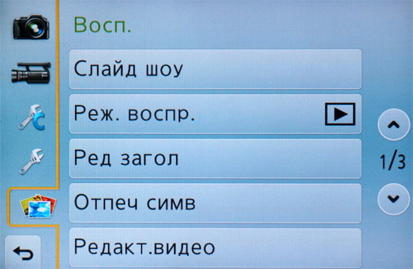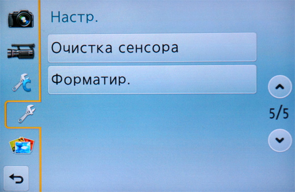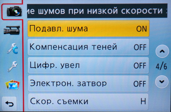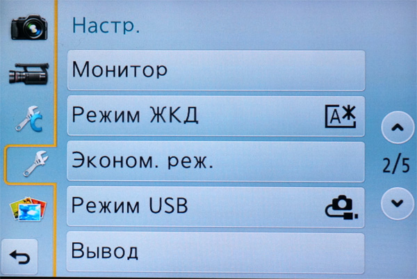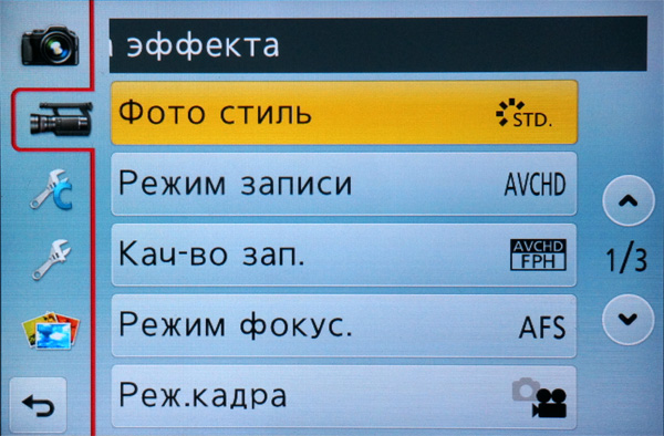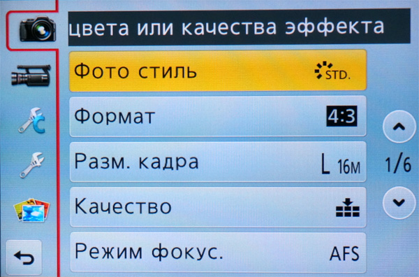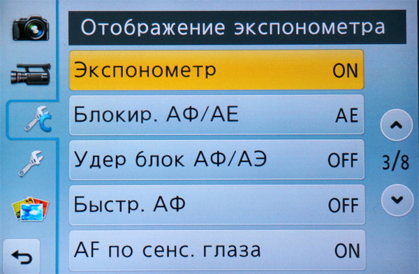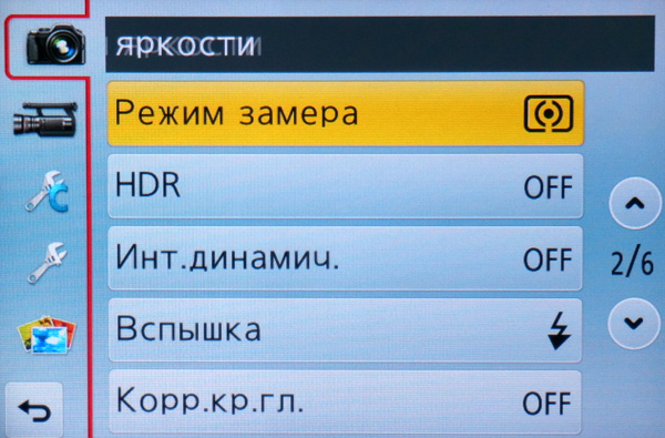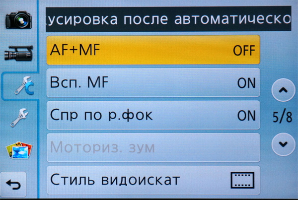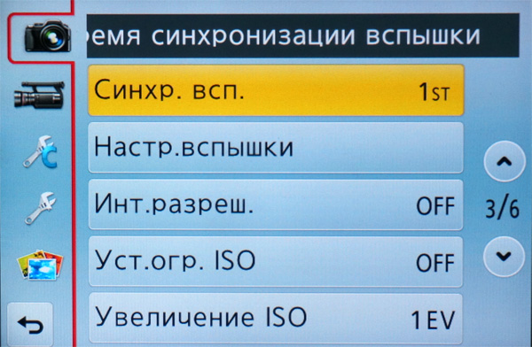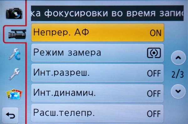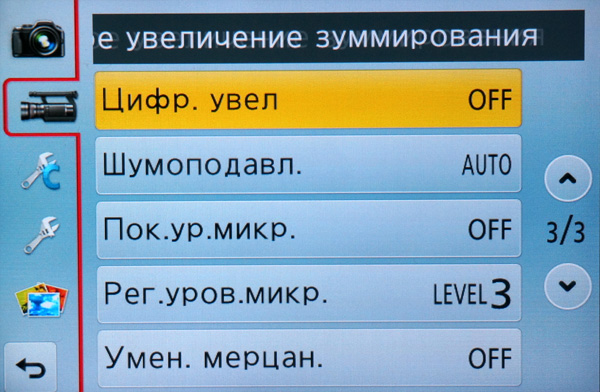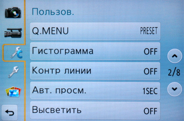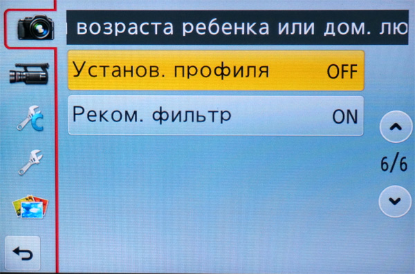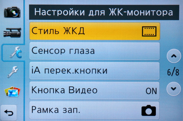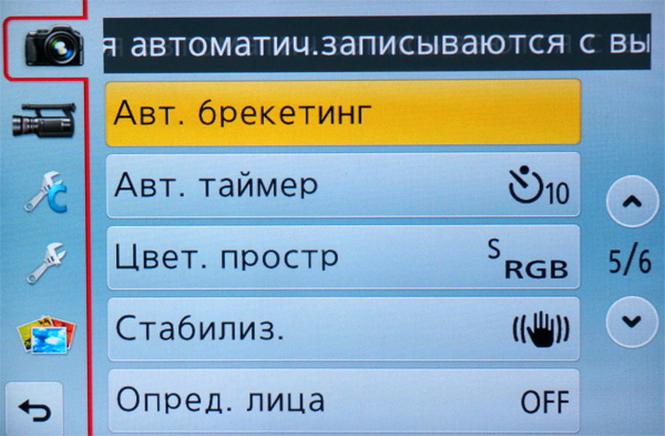 А теперь заглянем в настройки фотоаппарата. Они разбиты на пять групп: запись, видео, пользовательские меню, настройки и воспроизведение. При включении интеллектуального автоматического режима в настройках также появляется пиктограмма переключения с iA (автомат) на iA+ (это автомат с возможностями дополнительных подстроек).