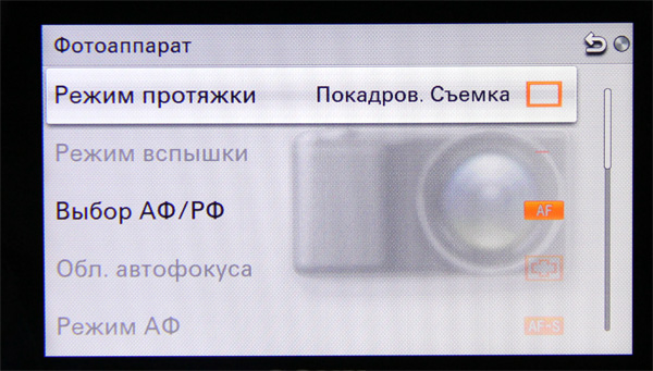 Задание режима протяжки (покадровая съемка, непрерывная, автоспуск, брекетинг), режима вспышки, фокусировки, области автофокуса, способа автофокусирования (покадровый, непрерывный), включение слежения за объектом, распознавание лиц, распознавание улыбки, включение эффекта мягкой кожи (съемка с мягкими телесными оттенками при использовании функции распознавания лиц), отображение информации на экране, функции кнопки Disp (отображение информации о съемке).