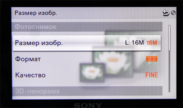 Выбор размера (16 М, 8.4 М, 4 М), формата (3:2, 16:9), качества (RAW, RAW+JPEG, высокое, стандартное), также настройки параметров 3D-панорамы, панорамы и видео.