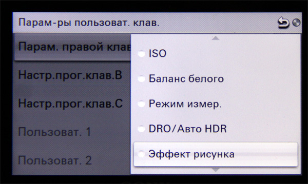 Очень важный пункт "Параметры пользовательской клавиатуры". Там можно настраивать клавишу "Вправо" зубчатого кольца, нижнюю программируемую кнопку и даже кнопку "ОК", на которую можно навесить целый список из пяти пользовательских настраиваемых функций.