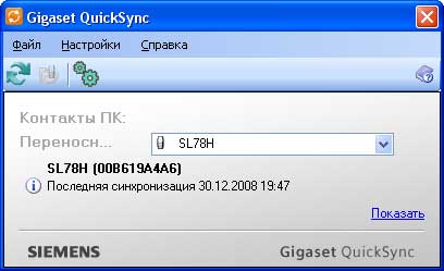Синхронизацию с Outlook я полез проверять в первую очередь. Система там простая. На компьютер устанавливается специальная программа Gigaset QuickSync, которая поставляется вместе с телефоном (или трубкой). Трубка подключается к компьютеру с помощью кабеля USB, далее регистрируется через программу, а потом в любой момент можно запустить синхронизацию, причем параметры настраиваются довольно гибко: можно задать соответствие полей, разрешение конфликтов и так далее.