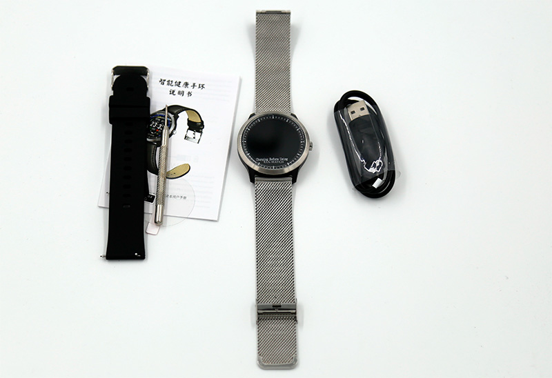 В комплекте: часы, кабель для зарядки, инструкция на английском и китайском, инструмент для снятия металлического ремешка, дополнительный пластиковый ремешок.