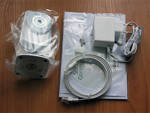 Камеры с подставкой, адаптер питания, сетевой кабель, два дюбеля с шурупами для крепления, инструкция, диск с программным обеспечением.