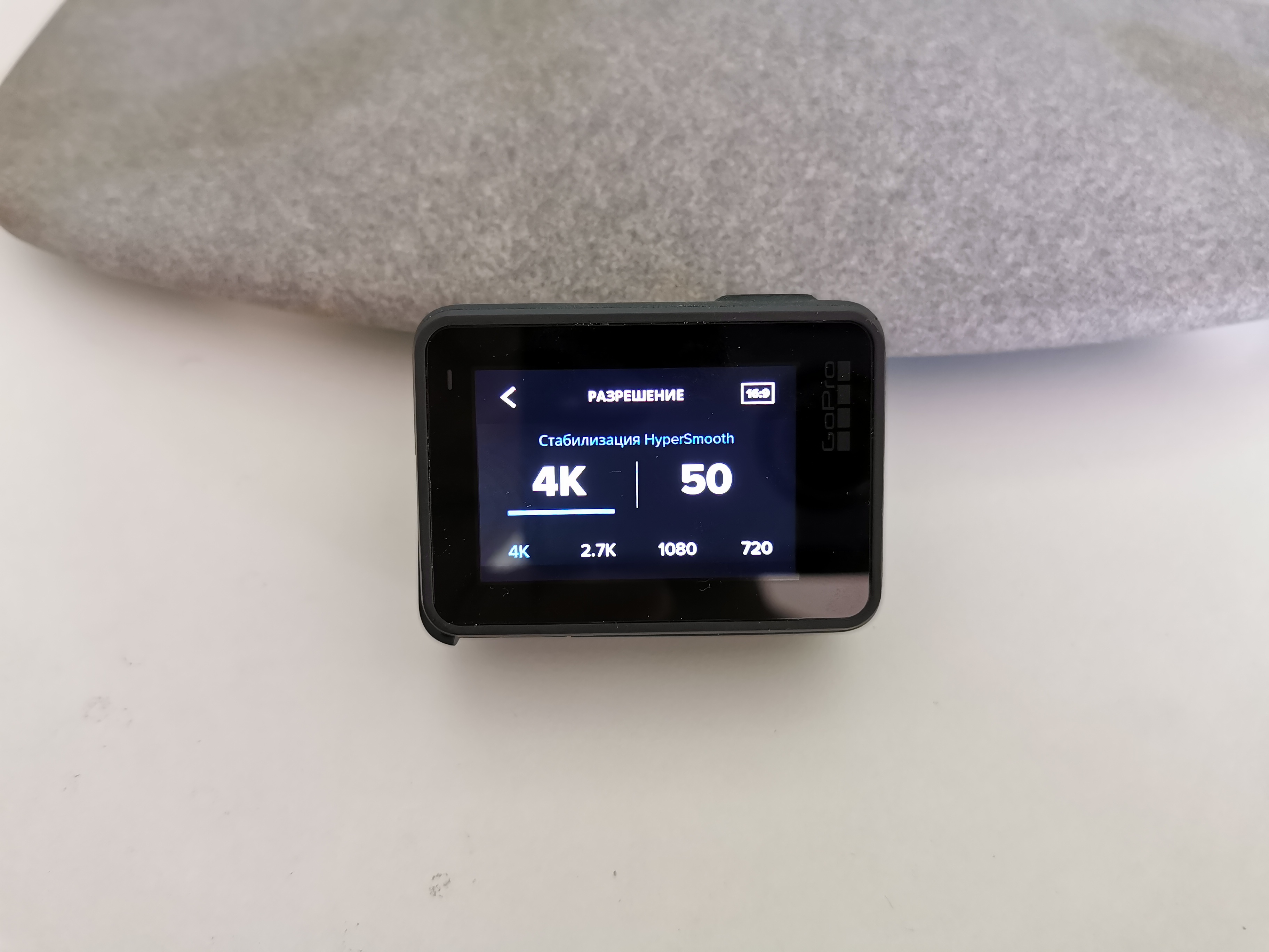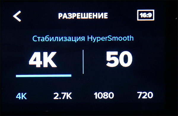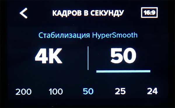 В настройках разрешения и fps сверху меняется настройка формата кадра: 4:3 или 16:9. В режиме 16:9 доступны максимальное качество и новый вид стабилизации HyperSmooth. Эта стабилизация доступна максимум при 4К 50 fps и меньших разрешениях и fps.
