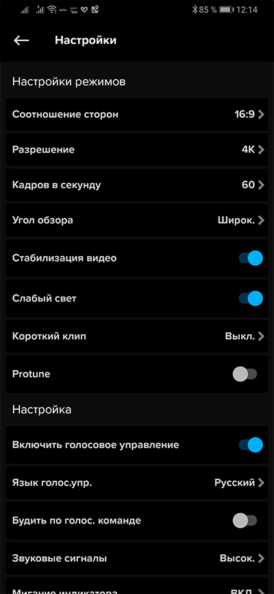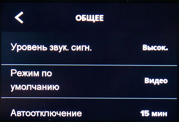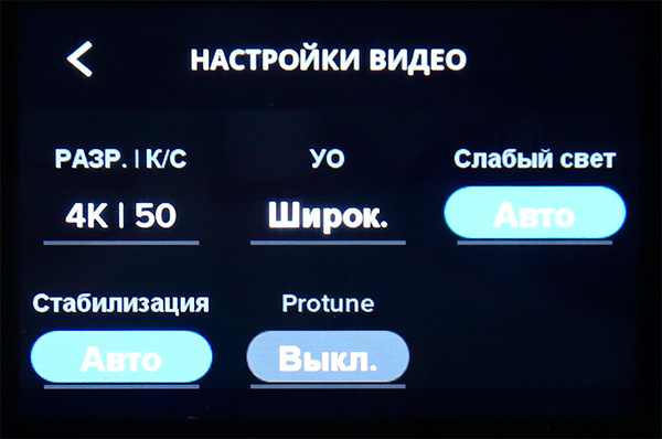 Режим настроек видео: разрешение, кадр/с, угол, режим слабого освещения, стабилизация, профессиональные установки (баланс белого, экспозиция и так далее).