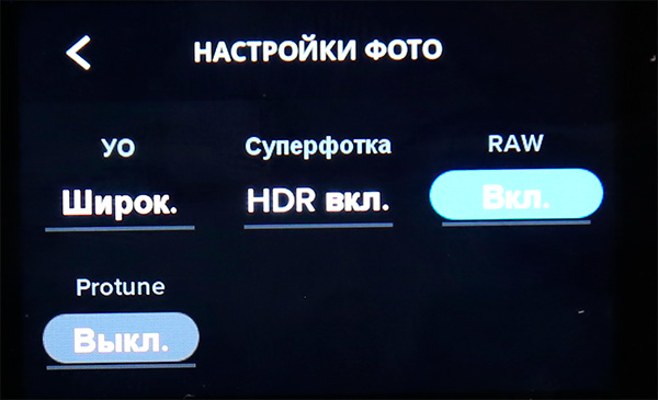 В режиме фото выставляется угол, включается режим HDR, съемка в RAW и профессиональная настройка.