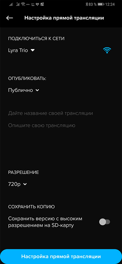 Для прямой трансляции в Facebook и другие сервисы, нужно подключиться к своему аккаунту, подключиться к сети Wi-Fi, оттуда есть доступ в Интернет, задать вид доступа и разрешение (720p - потолок).