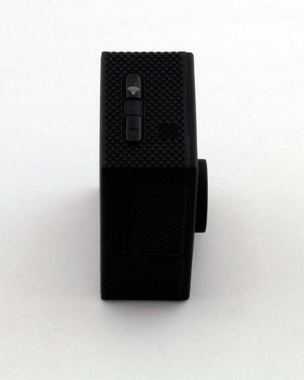 На правом торце - кнопки вверх-вниз и малюсенький контрольный динамик. Кнопкавверх в режиме видеозаписи может включать-выключатьмикрофон (кстати, это очень удобно), а врежиме просмотра включает режим передачипо Wi-Fi (для скачивания медиаданных и дляуправления камерой со смартфона).