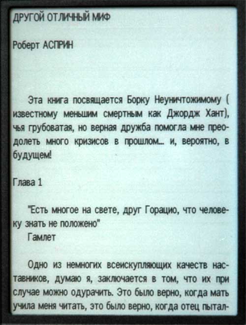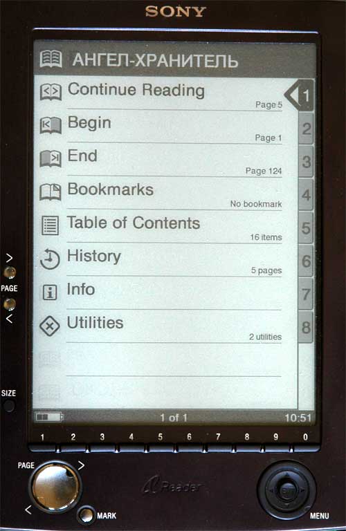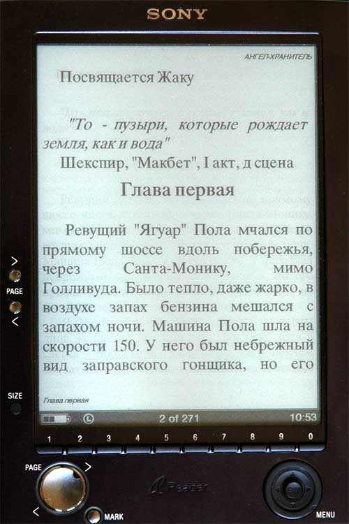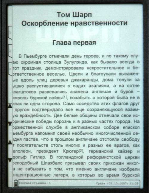 Сразу после приобретения устройства читать на нем русские книжки - не получится, кириллицу оно не понимает. Однако если воспользоваться подробнейшими инструкциями с того же The-Ebook.org - перепрошивка ридера займет минут пятнадцать, после чего с кириллицей будет все более или менее.