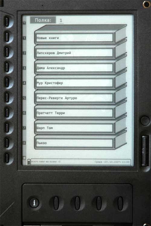Книги могут загружаться как в собственную память устройства, так и на SD-карточке. (SD-карты поддерживаются любые, включая двухгиговые, формат допускается и FAT32.) На самом устройстве доступно 128 мегабайт. При выводе списка книг заголовки берутся и из памяти устройства, и с SD-карты (если она вставлена и на ней есть книги).