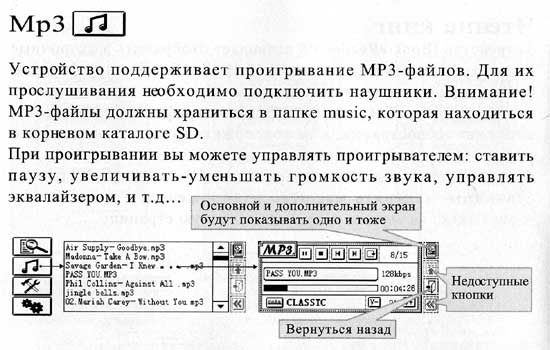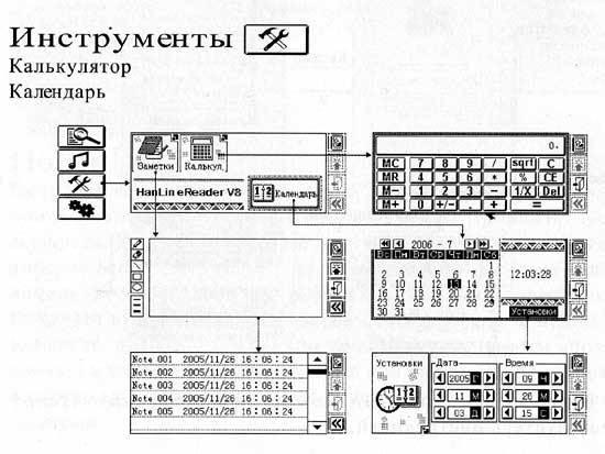 Воспроизведение MP3, инструменты - календарь, калькулятор, заметки.