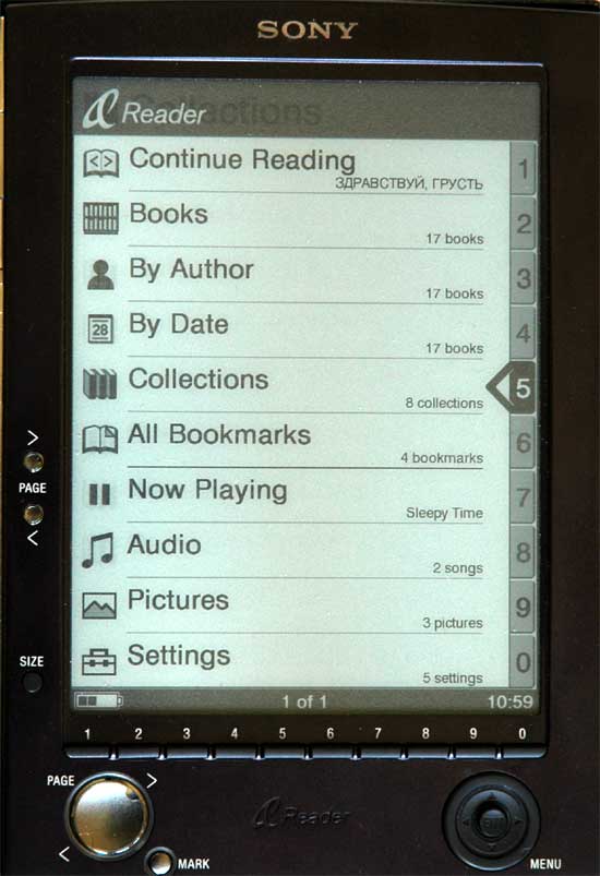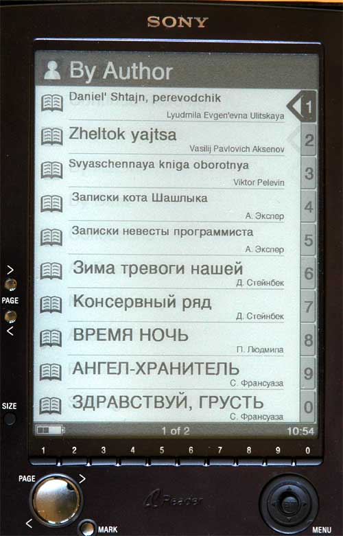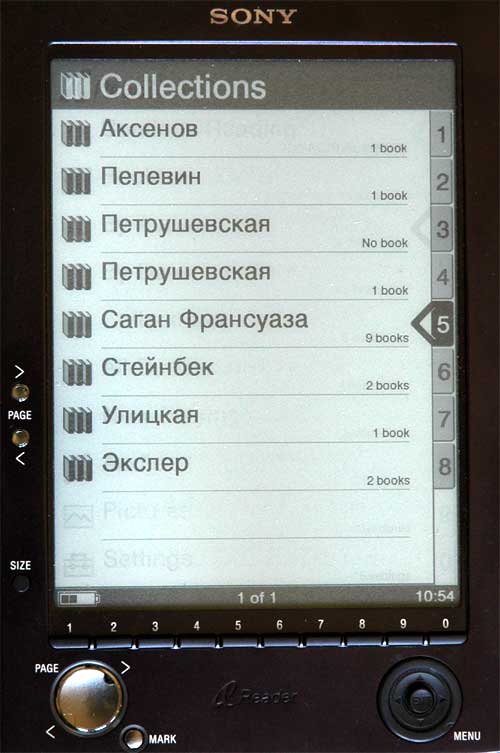 С навигацией по книгам у Sony Reader все очень плохо. Древовидная структура папок не поддерживается вообще. Книги тупо выводятся списком по десять заголовков на странице, и искать нужные - не сильно просто. Сортировка по авторам работает только для латиницы, так что от нее мало толку. Единственное - ридер поддерживает так называемые коллекции, то есть одноуровневую систему папок. Но она работает только при использовании основной памяти устройства и не срабатывает на SD-картах.