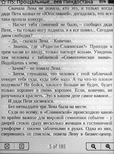 А если начать увеличивать масштаб, то на экран выводится только часть страницы и, чтобы прочитать страницу целиком, по ней приходится елозить, как гномику по баскетболистке, читая кусочками. На мой взгляд, это не чтение. Это дурдом какой-то. Уж если даже на Amazon Kindle DX документы PDF читать совсем не фонтан, то, значит, не судьба.