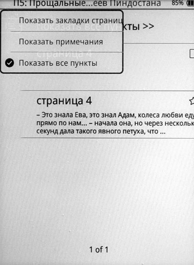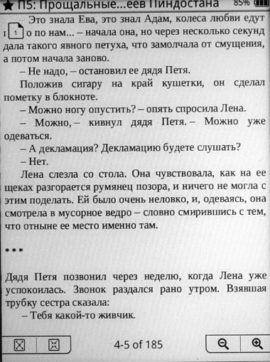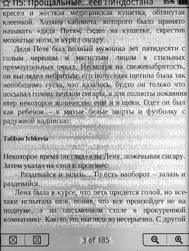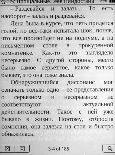Понятно, что такой режим сделан для экономии энергии аккумулятора - при неполном обновлении страницы электричества тратится меньше. Но лично я бы предпочел, чтобы ридер тратил больше энергии, но каждую страницу обновлял полностью, потому что эти треки - они реально раздражают. Причем насколько сильно текст будет загрязнен, очень зависит от характера текста и действий с ним. Иногда у меня получался вот такой вот громкий ужас.