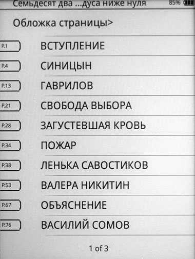 Реакция у экрана SiPix более неторопливая по сравнению с E-Ink. Страница файла FB2 переворачивается за две секунды, причем тут, в отличие от E-Ink, чисто визуально все выглядит совершенно по-другому. При нажатии кнопки смены страницы (или проведении пальцем по экрану) текст сначала становится жирнее, затем страница почти очищается, причем на ней видны следы каких-то букв, затем появляется жирный текст новой страницы и после этого контрастируется до нормального шрифта. Так как процесс происходит достаточно медленно, я сумел заснять все этапы.