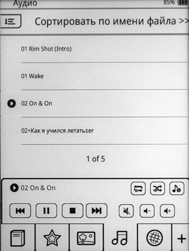 Список песен ридер выводит так же, как и список книг, поэтому даже с сотней треков вы замучаетесь искать нужный.
