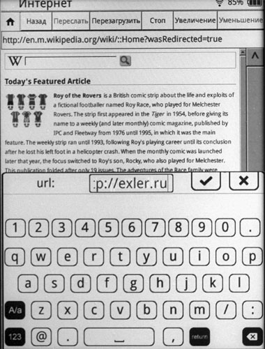 У ридера есть модуль Wi-Fi, который нормально подключается даже к защищенным Wi-Fi-сетям. При наличии подключения к Сети можно заходить на какие-то сайты. Есть предустановленный набор сайтов, но вы также можете вбить любой адрес.