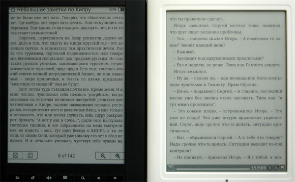 Чем экран SiPix чисто практически отличается от E-Ink? Во-первых, подложка экрана заметно серее E-Ink третьего поколения и напоминает подложку E-Ink второго или даже первого поколения. Однако так как шарики в ячейках по сравнению с E-Ink поднимаются ближе к поверхности экрана, текст на SiPix выглядит заметно четче и контрастнее.