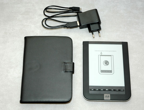Комплектация у "Айчиталки" неплохая: кроме традиционного USB-кабеля с сетевым адаптером пользователям также предлагается прилично выглядящий чехол-папка.