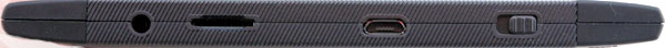 В верхнем торце - выход под наушники, слот под microSD-карты, выход microUSB и слайдер включения-выключения.