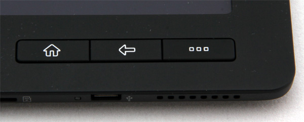 Несмотря на то, что экран - сенсорный, в ASUS разорились аж на пять кнопок управления, расположенных на лицевой части: домой, возврат, меню, ну и справа по центру - две кнопки листания.